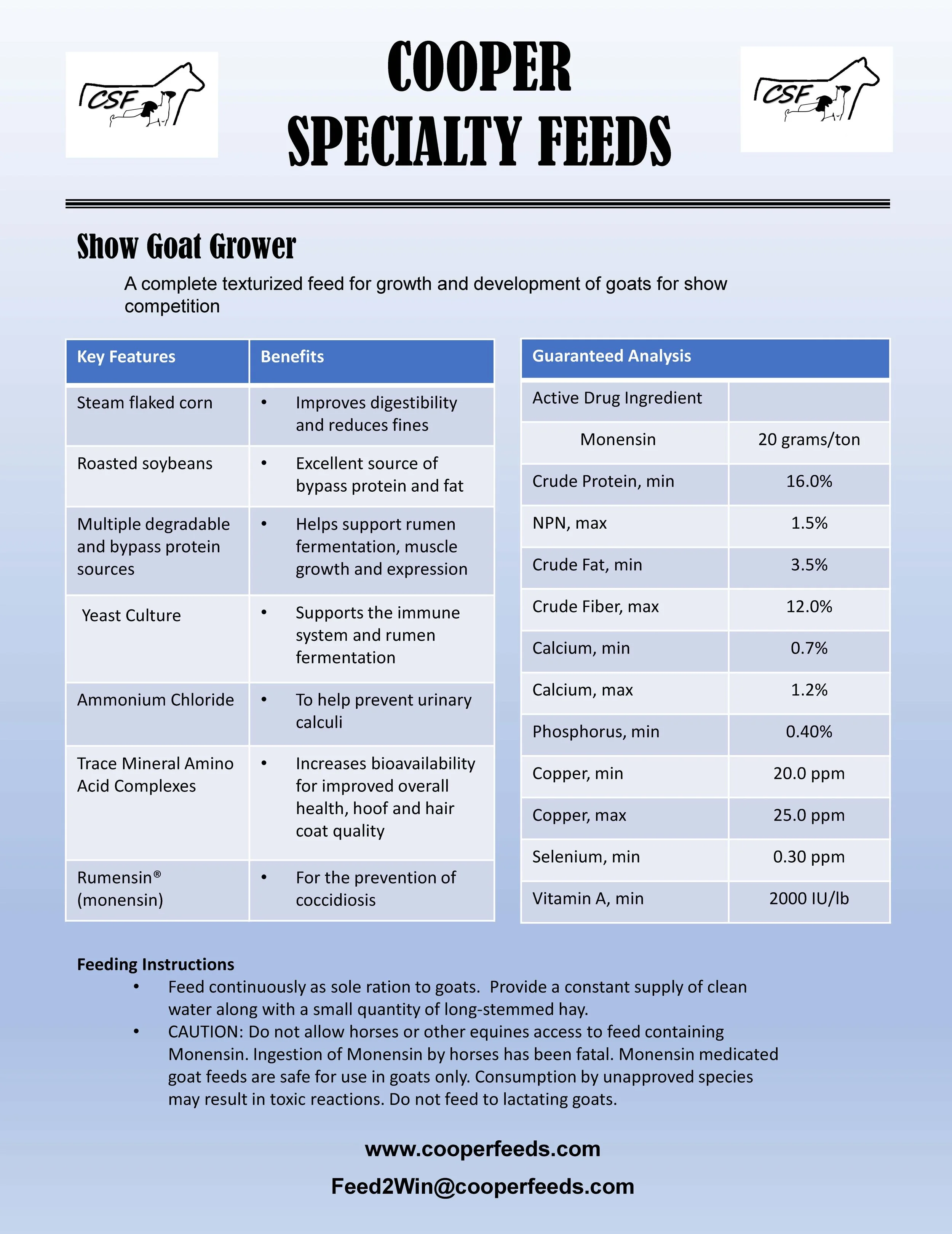 • CAUTION: Do not allow horses or other equines access to feed containing Monensin. Ingestion of Monensin by horses has been fatal. Monensin medicated goat feeds are safe for use in goats only. Consumption by unapproved species may result in toxic reactions. Do not feed to lactating goats.