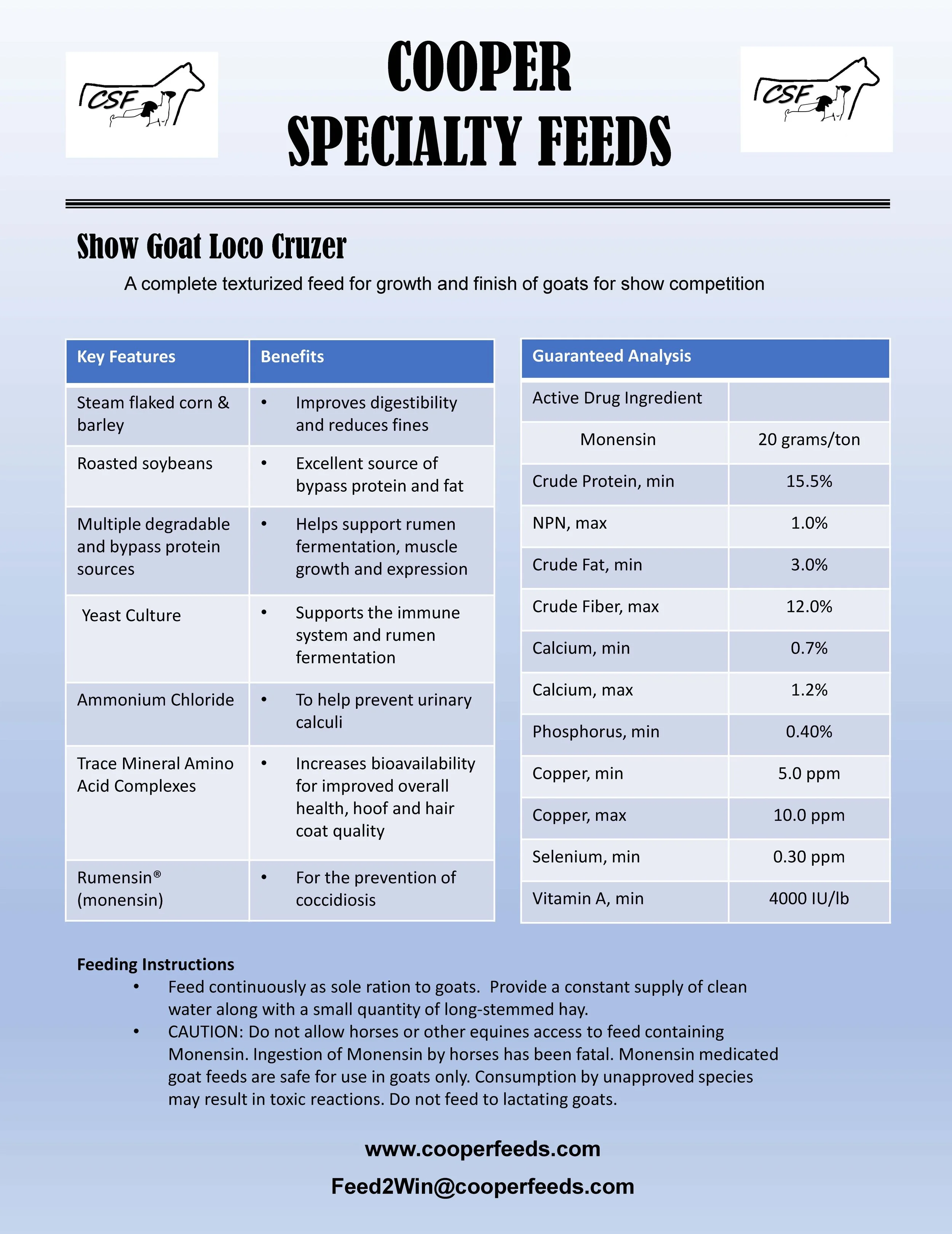 • CAUTION: Do not allow horses or other equines access to feed containing Monensin. Ingestion of Monensin by horses has been fatal. Monensin medicated goat feeds are safe for use in goats only. Consumption by unapproved species may result in toxic reactions. Do not feed to lactating goats.