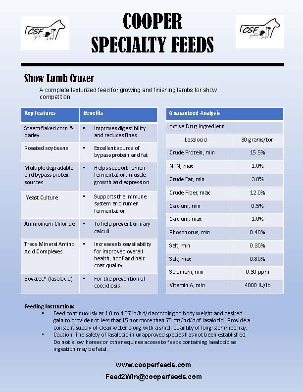 • Feed continuously at 1.0 to 4.67 lb/hd/d according to body weight and desired gain to provide not less that 15 nor more than 70 mg/hd/d of lasalocid. Provide a constant supply of clean water along with a small quantity of long-stemmed hay.