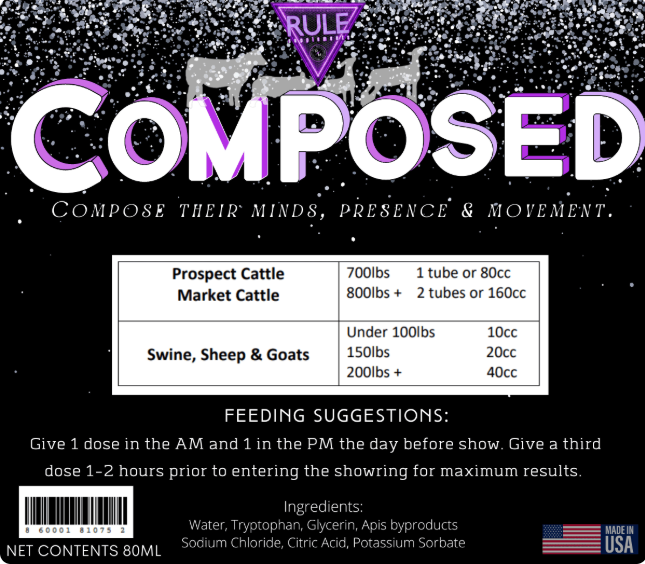 Rule Supplements is excited to announce COMPOSED, our newest pre-show paste to address the anxiety and stress that restricts an animal's ability to comfortably present themselves. Compose their mind, enhance their presence and relax their skeleton increasing flexibility.